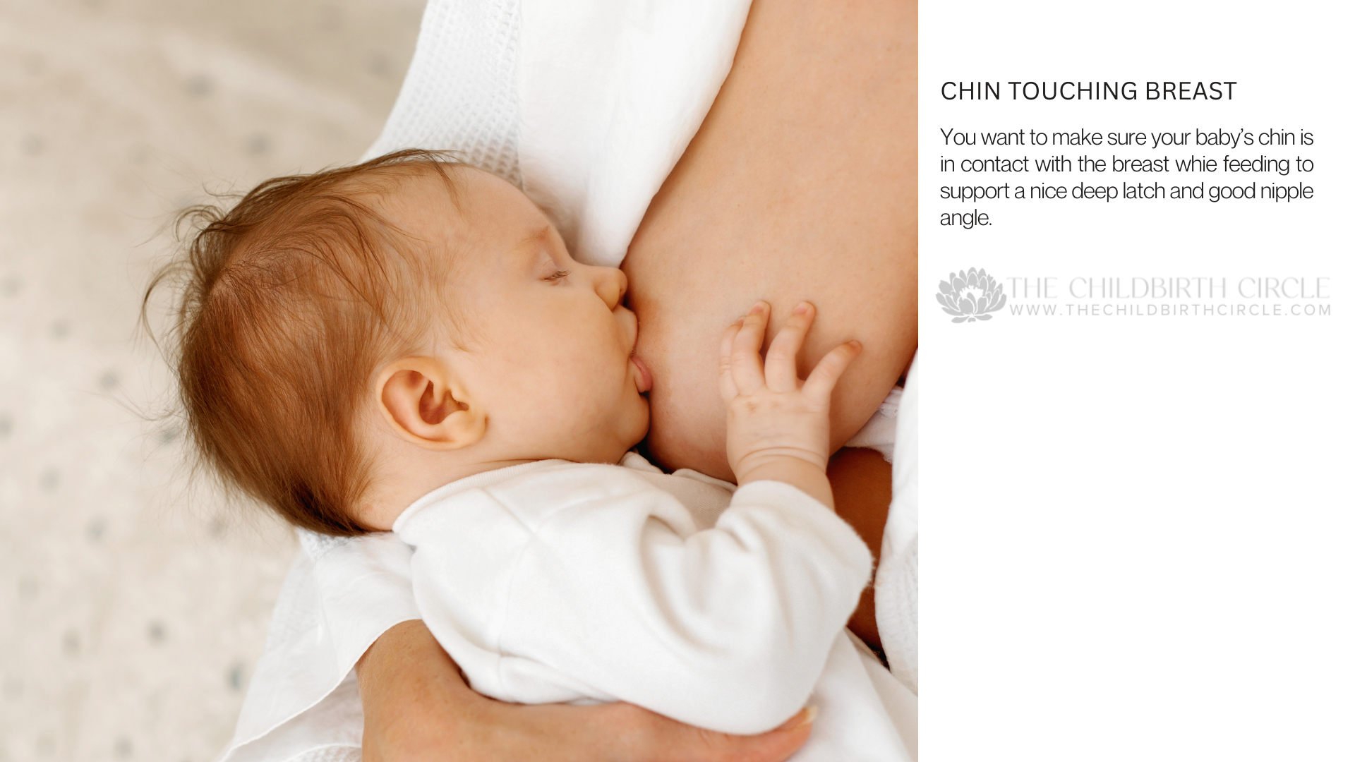 Having your baby’s chin touch the breast helps ensure the nipple is at the proper angle, pointing toward the roof of the mouth. Remember that we want the nipple to reach the soft palate during feeds.