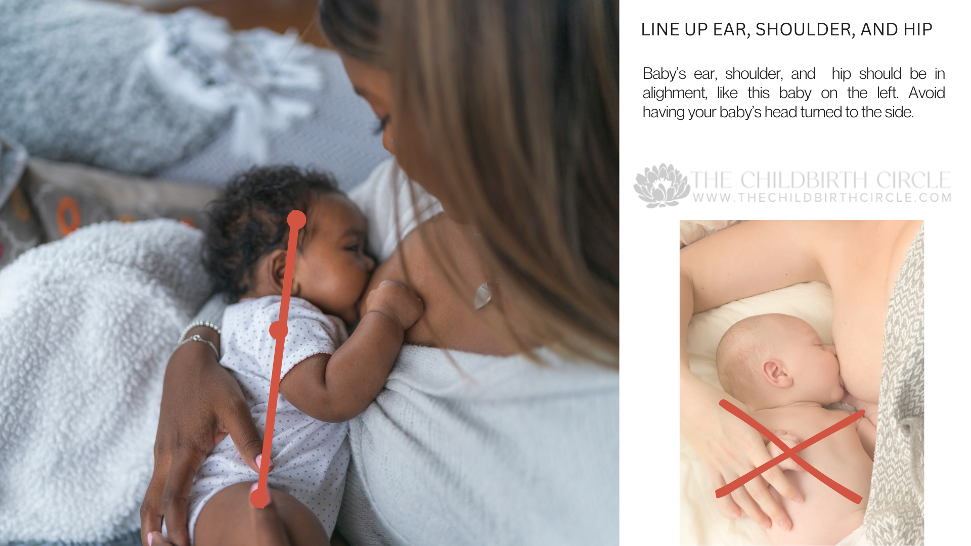 Good latch sign #3: Baby’s ear, shoulder, and hip form a straight line.