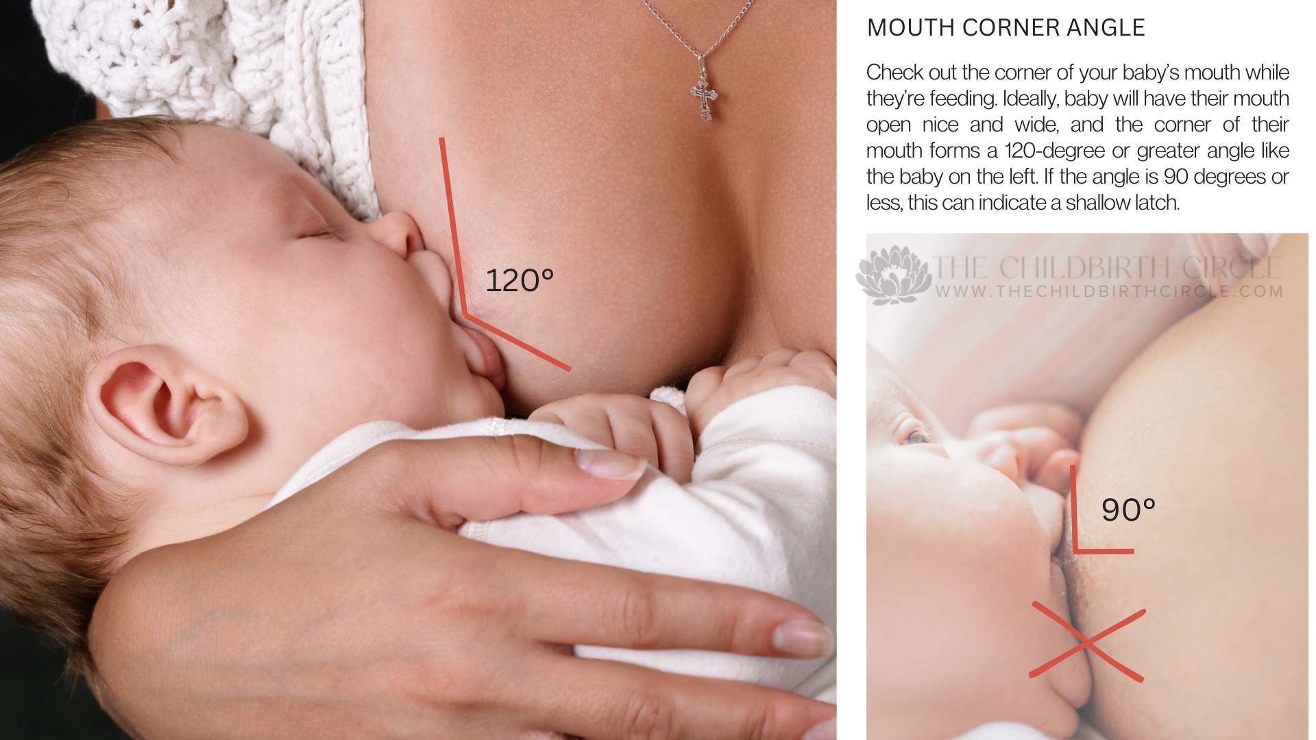 Good latch sign #1: The corner of your baby’s mouth forms a ≥120-degree angle.